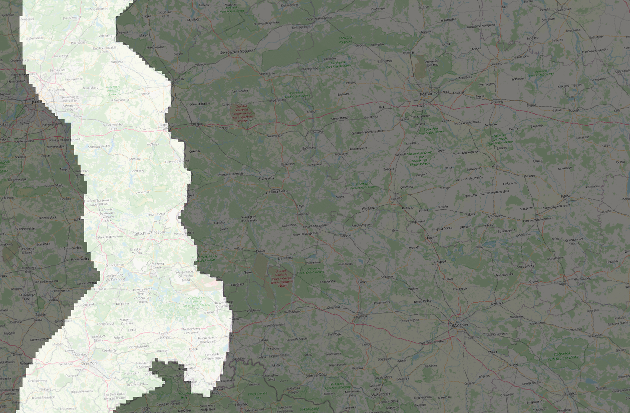 Left: Area of concern left from Polish borderLeft-down: Current epidemic status - blue: healthy; red: infected/infectious; green: survived animals (brightness expresses numbers) Below: First variant type (colour) affecting the family group. New variants form spatial clusters while spreading into the teritorry. |